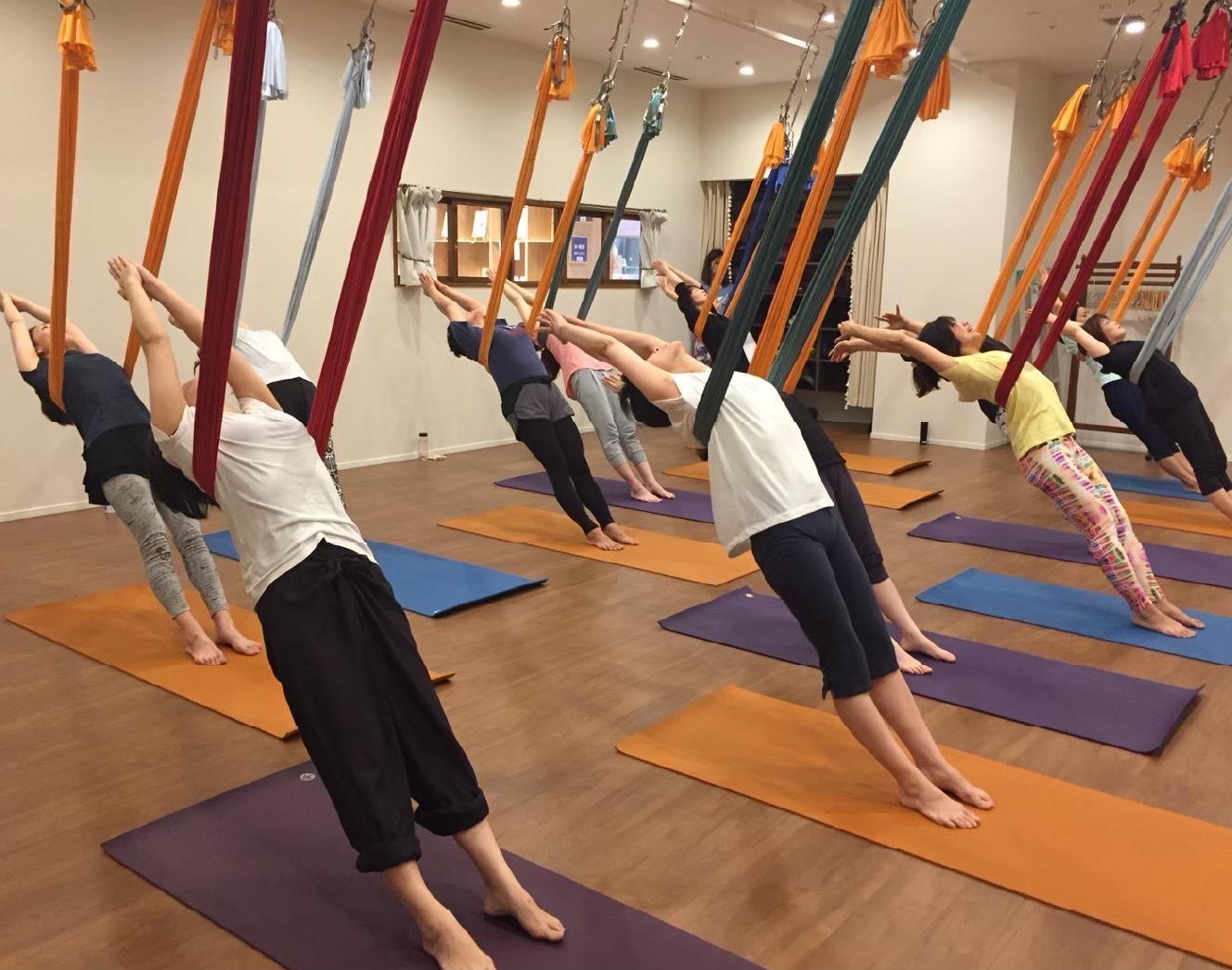 空中ヨガクラスは【上】半袖など袖のあるもの(ノースリーブ、フード付き不可)【下】ふくらはぎが隠れるもの、裾がすぼまっている方がよい(ジャージ、スウェット、レギンス等) ※アクセサリー類はレッスン前に外していただきます。